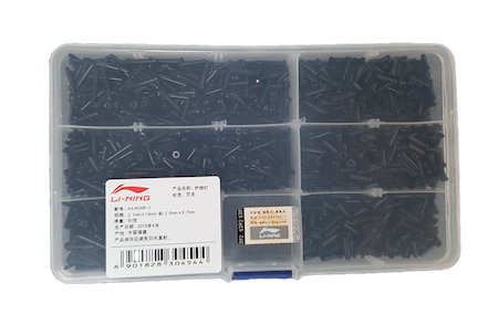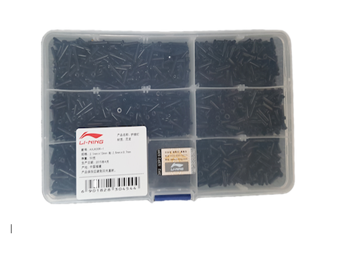 A box filled with around 300 black grommets in two sizes, each proudly sporting the Li-Ning logo on both sides. Perfect for adding a splash of style to your badminton gear!
