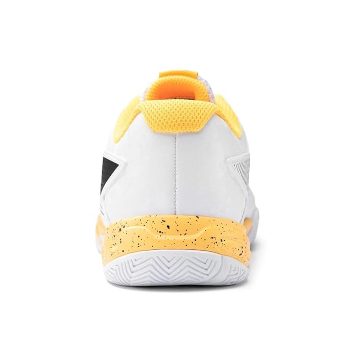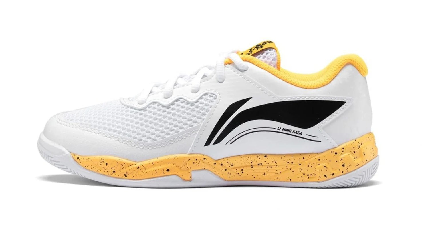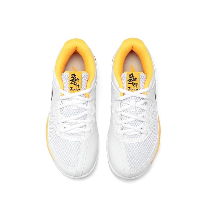 Li-Ning children's badminton shoes in white with black and yellow accents. Synthetic leather and textile upper with non-marking gum rubber sole.